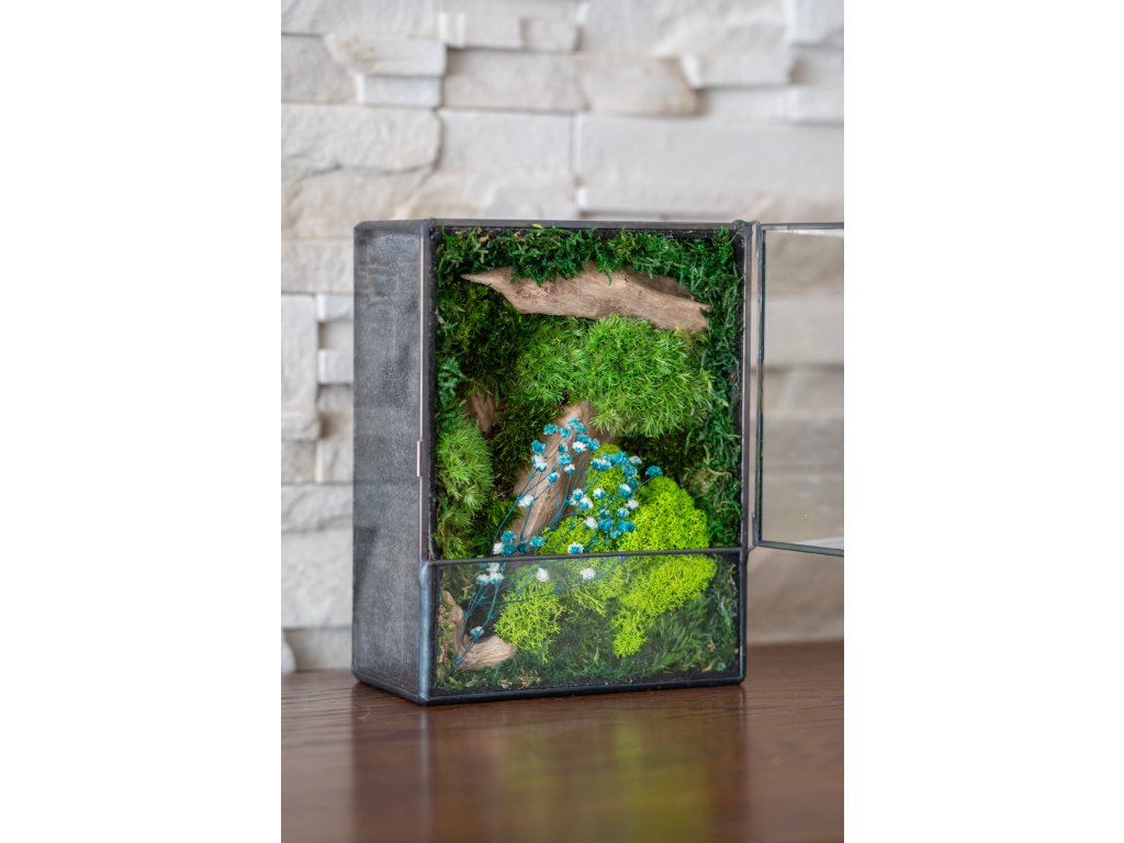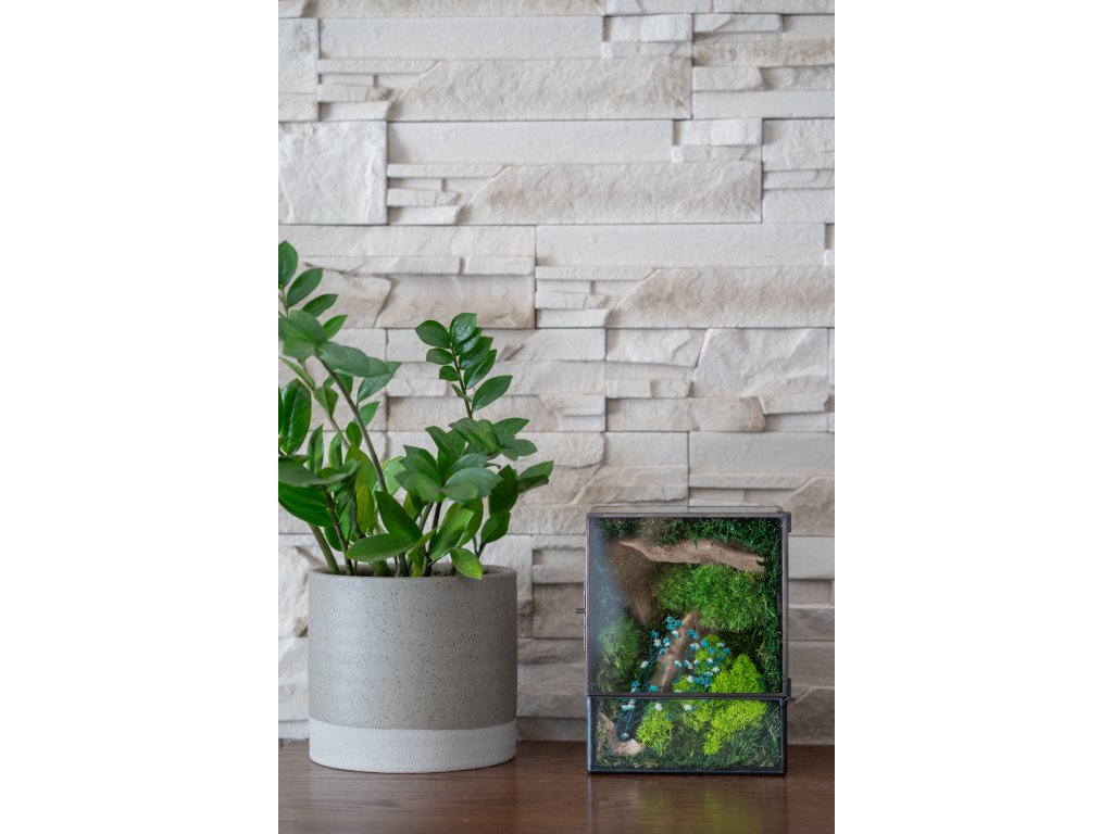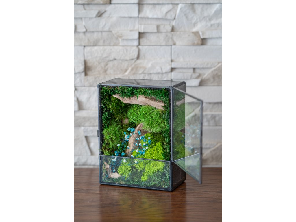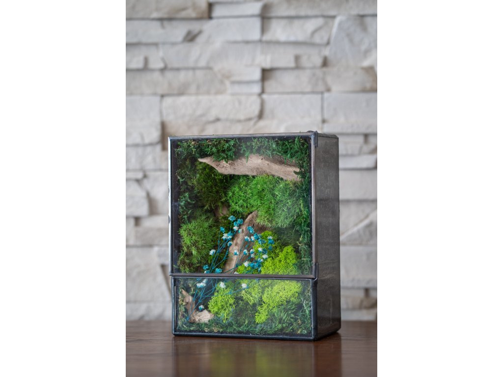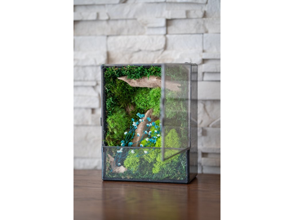 Obsah terária: Terárium obsahuje výhradne stabilizovaný mach, ktorý si zachováva svoju prirodzenú sviežu zelenú farbu po celé roky. Mach je ekologicky upravený tak, aby nevyžadoval žiadnu údržbu. Terárium je pevné, vyrobené technikou cínovania z priehľadného 2 mm skla, čo zabezpečuje jeho odolnosť a elegantný vzhľad.