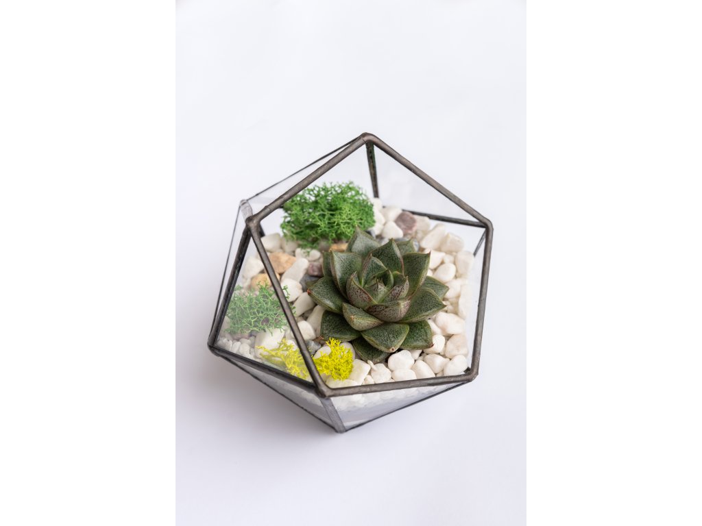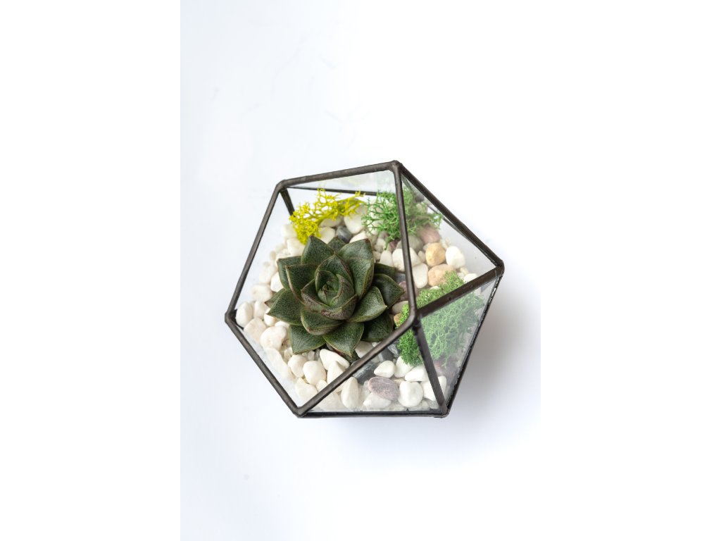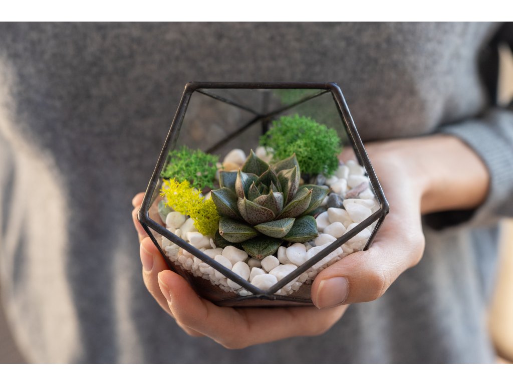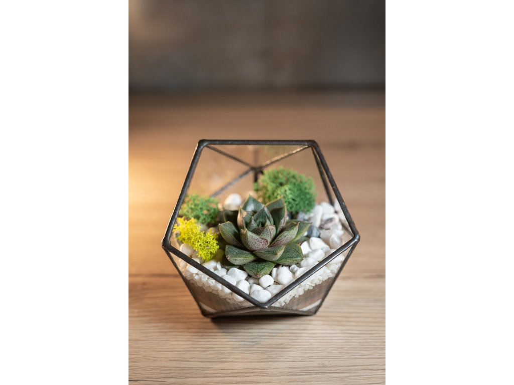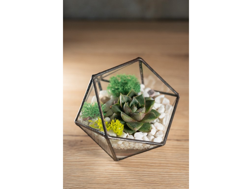 Geometrické sklenené terárium so sukulentom je živá, moderná, interiérová dekorácia, ktorá do vášho domova či kancelárie prinesie kúsok prírody v originálnej podobe. Vďaka svojmu jedinečnému tvaru pôsobí štýlovo a minimalisticky, takže sa hodí do každého priestoru od obývačky až po pracovný stôl.